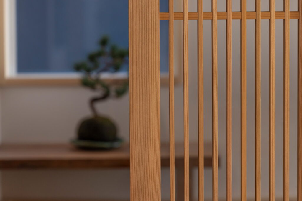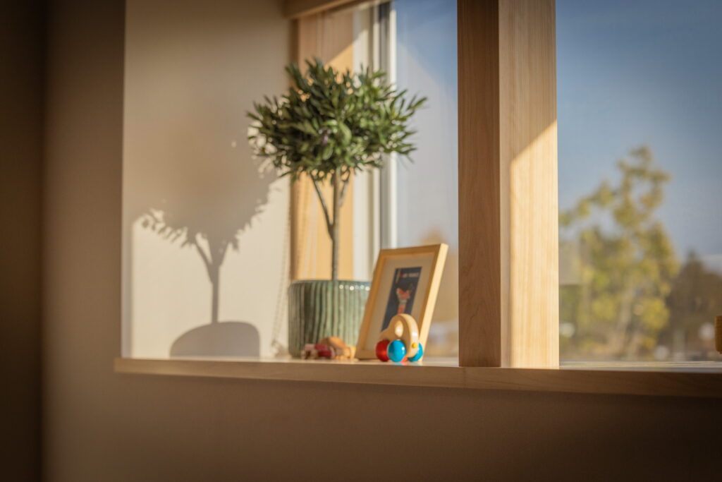 大きな窓はただの開口ではなく、視線を丁寧に整えることで、外の風景を一枚の絵のように室内へ取り込みます。リビングに立つと、新緑の気配や光の移ろいがやわらかく広がり、季節の変化を日常の中で感じられる空間に仕上がっています。