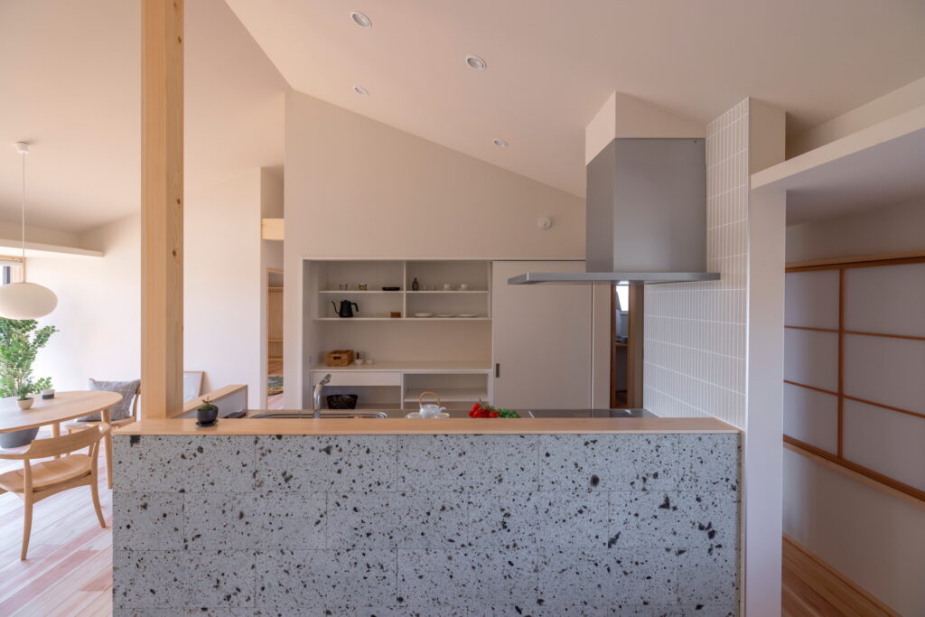 キッチンまわりは、家電や冷蔵庫の存在感を抑え、生活感を感じさせない落ち着いた佇まいに。無垢の床や調湿性のある壁材など、触れたときに心地よさを感じる素材を選び、視覚だけでなく体感としての心地よさを大切にしています。
