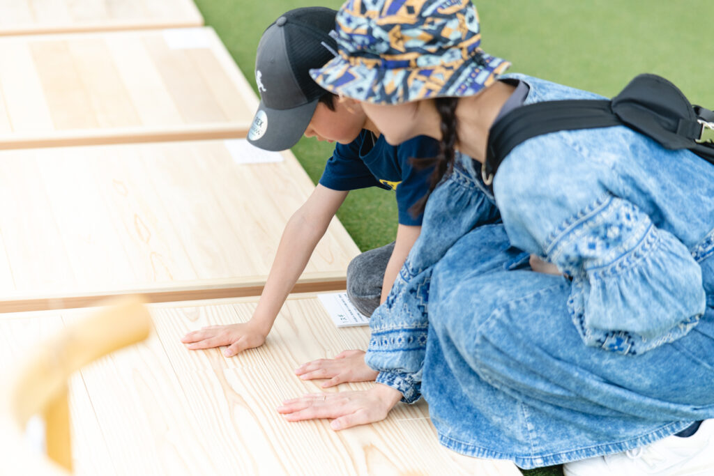 毎回マルシェで大好評の無垢床踏み比べ…今回もヒノキや赤松など全8種をご用意!