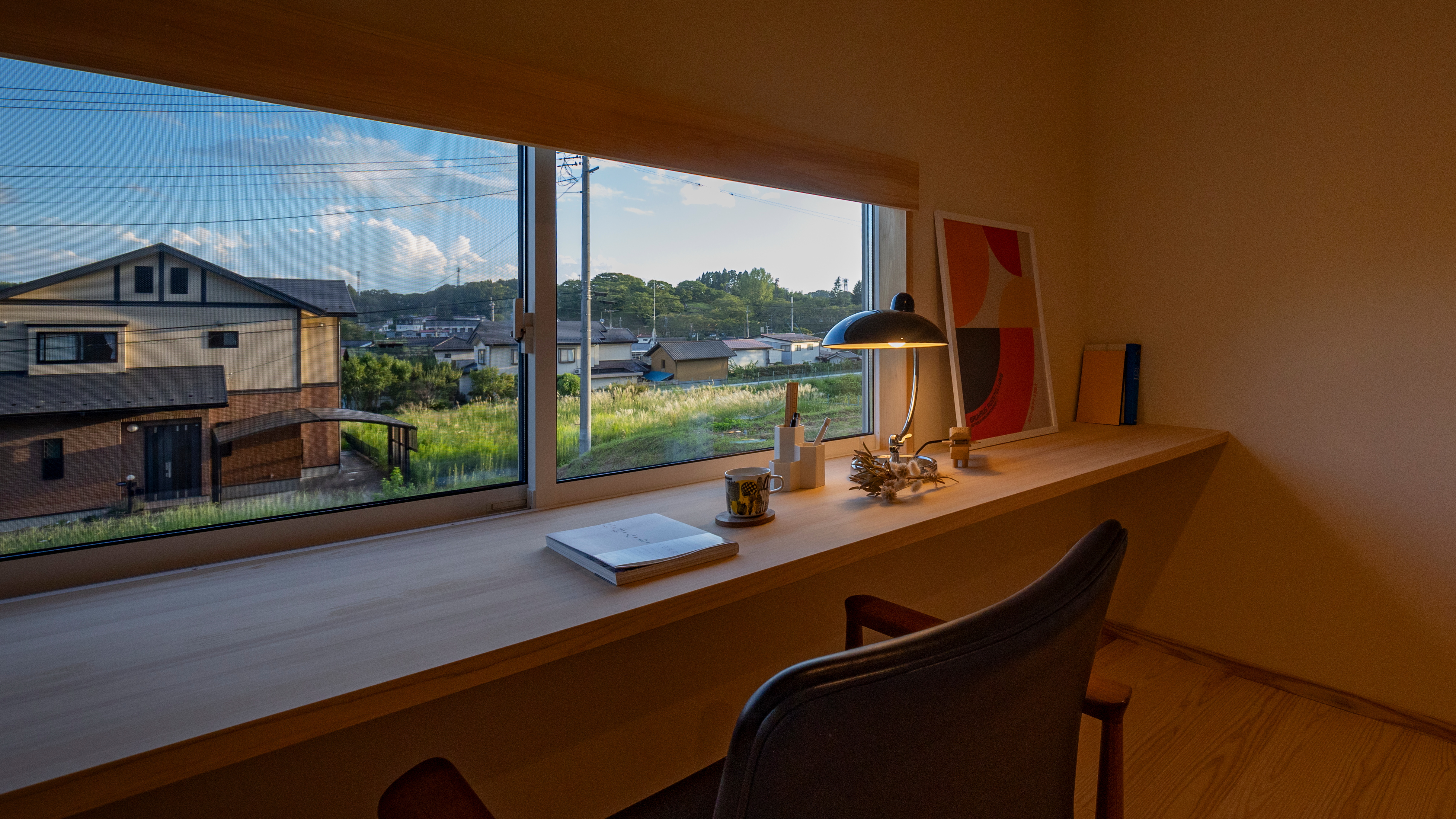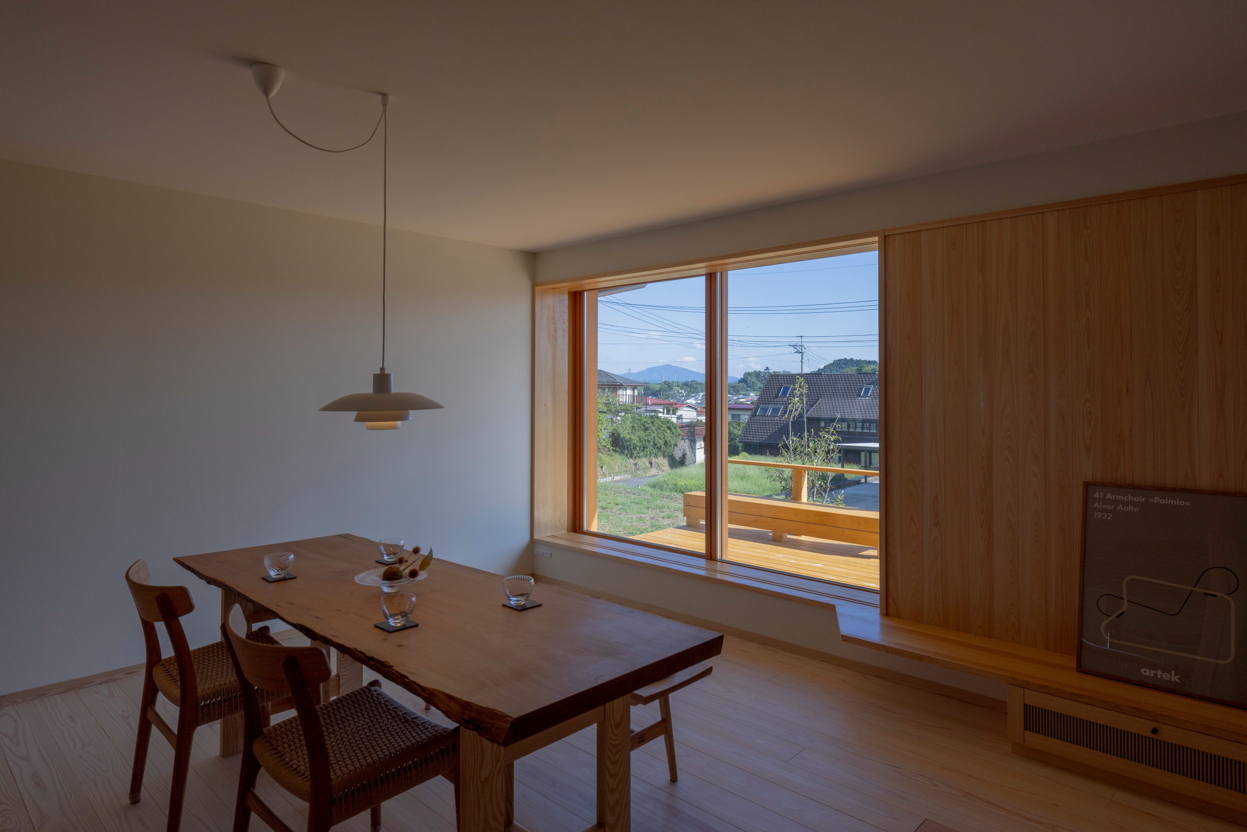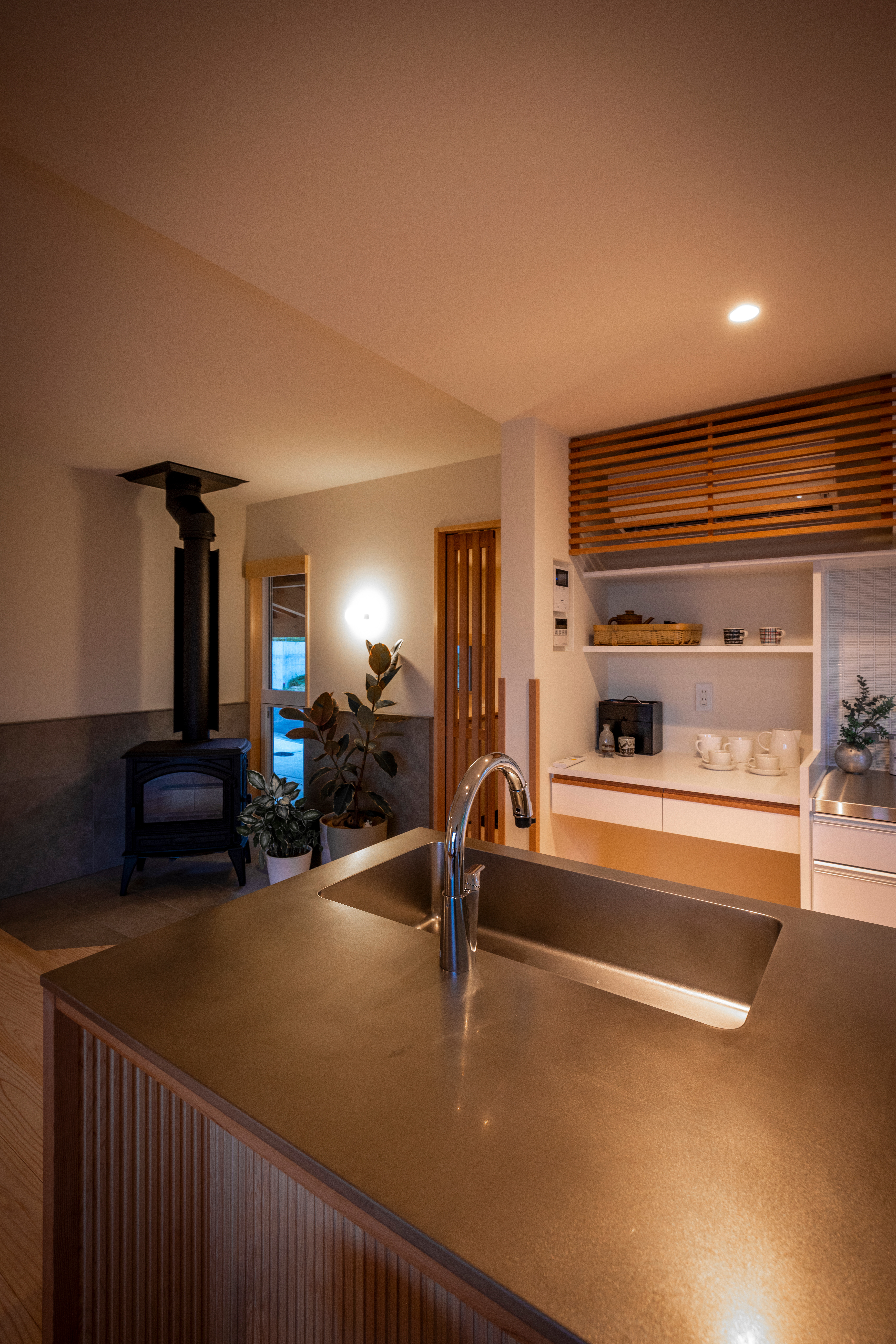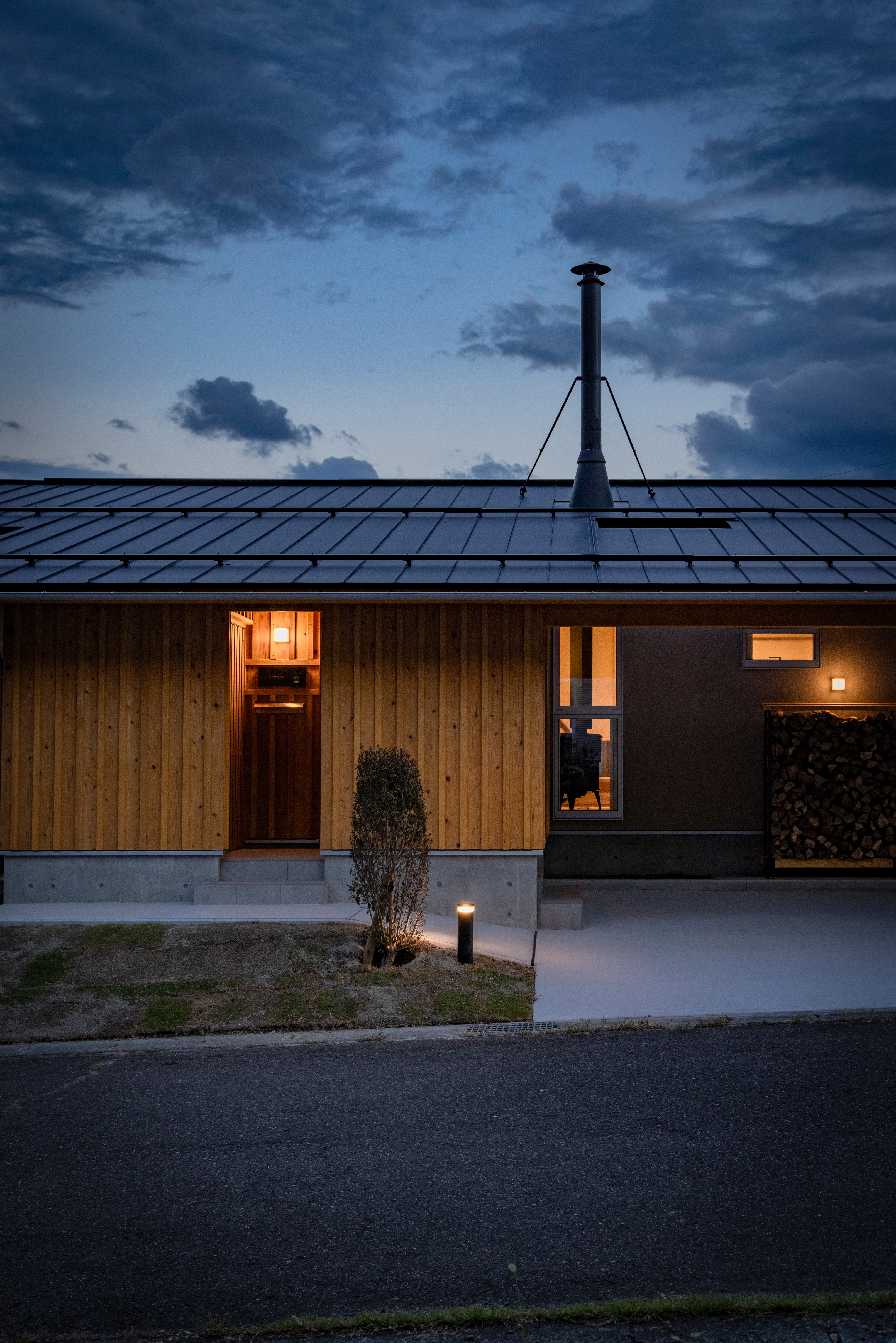 眺望と豊かな緑に抱かれ、夫婦がそれぞれの趣味や時間を慈しみ、心ゆくまで寛げる理想のお家。緩やかな勾配天井の屋根と外収納・ガレージを一体で建築し、落ち着いた雰囲気のデザインとなりました。薪ストーブの炎を囲んで語り合い、檜風呂の香りに包まれながら景色に癒され、借景を望むキッチンで料理を満喫する。そんな、日々の豊かな営みがここにあります。
