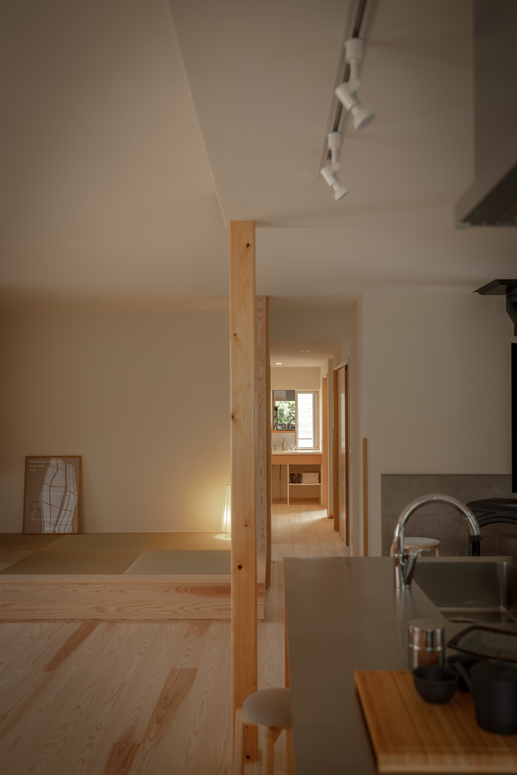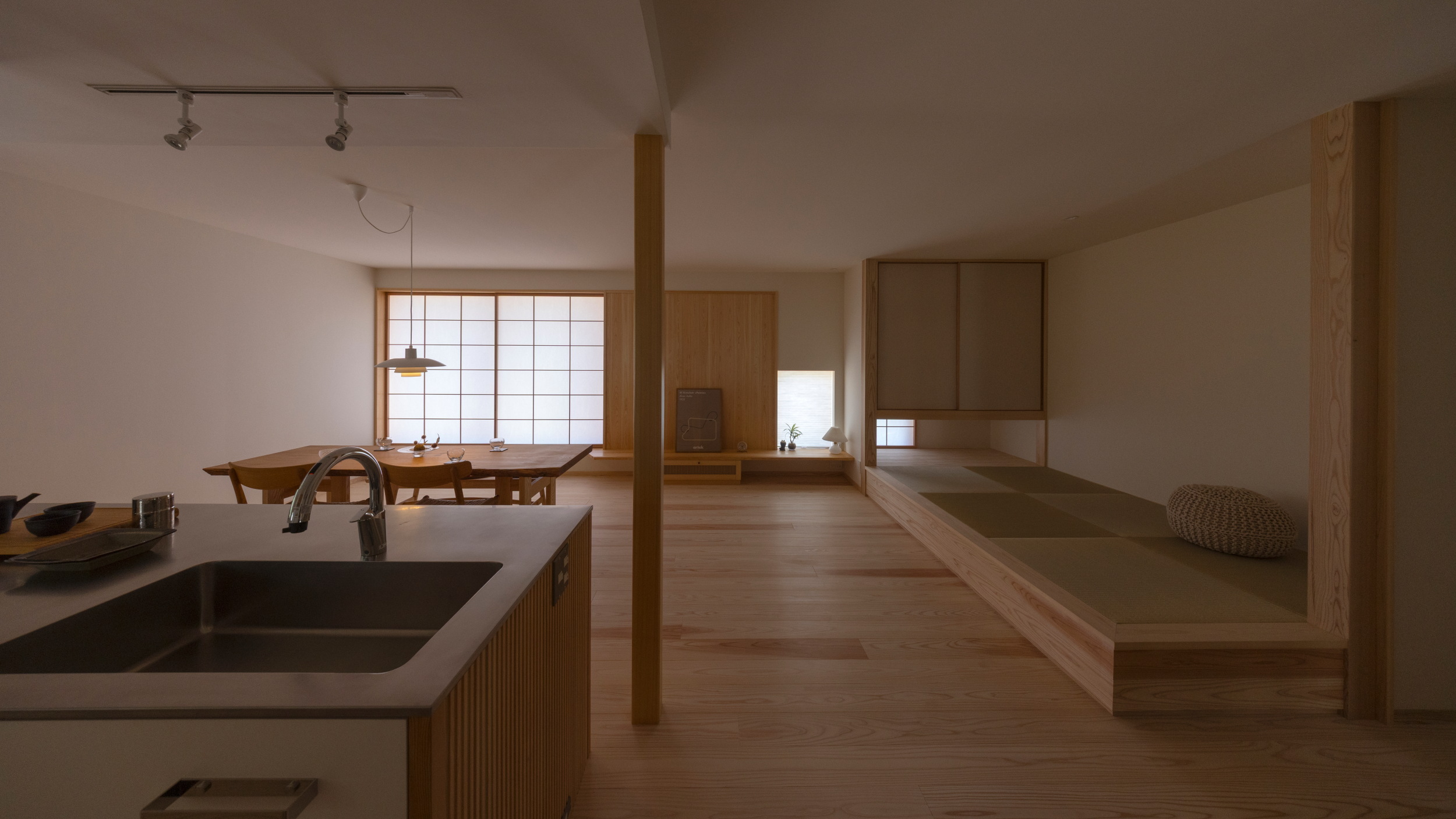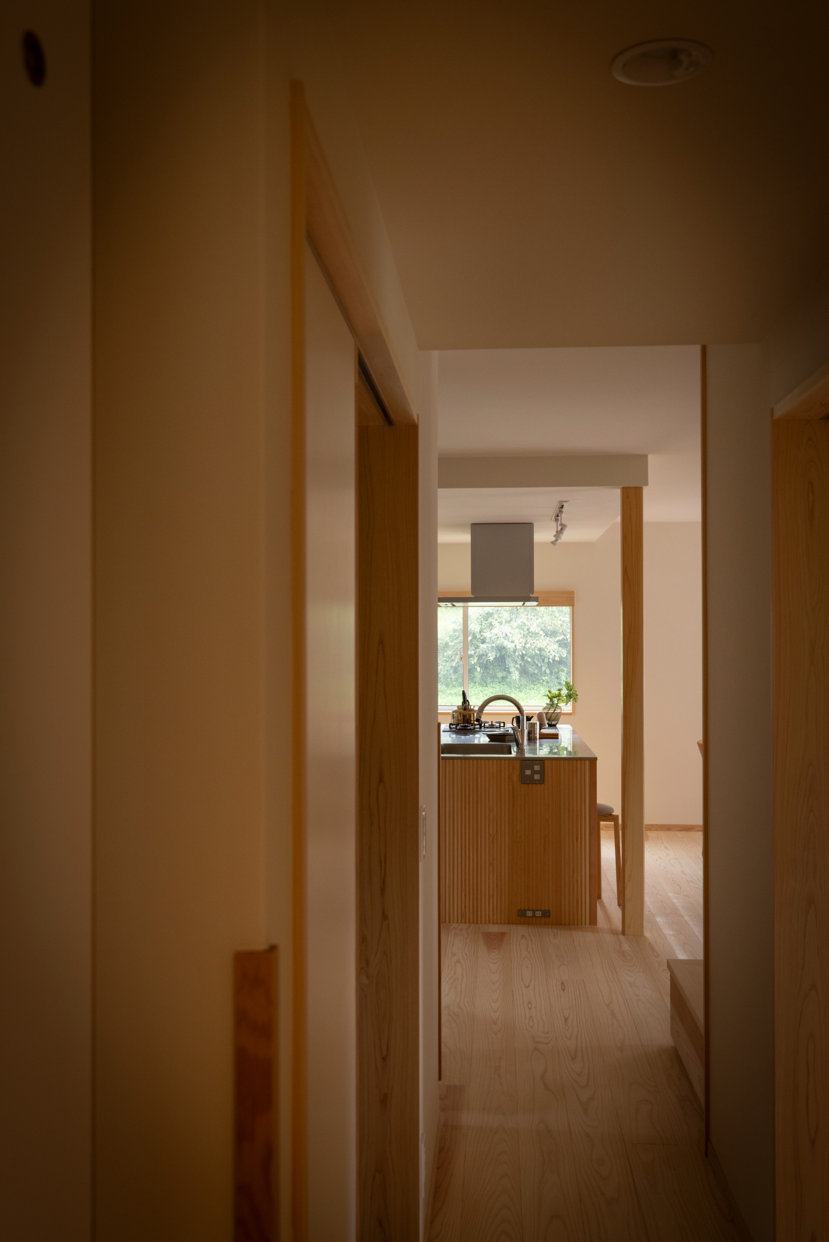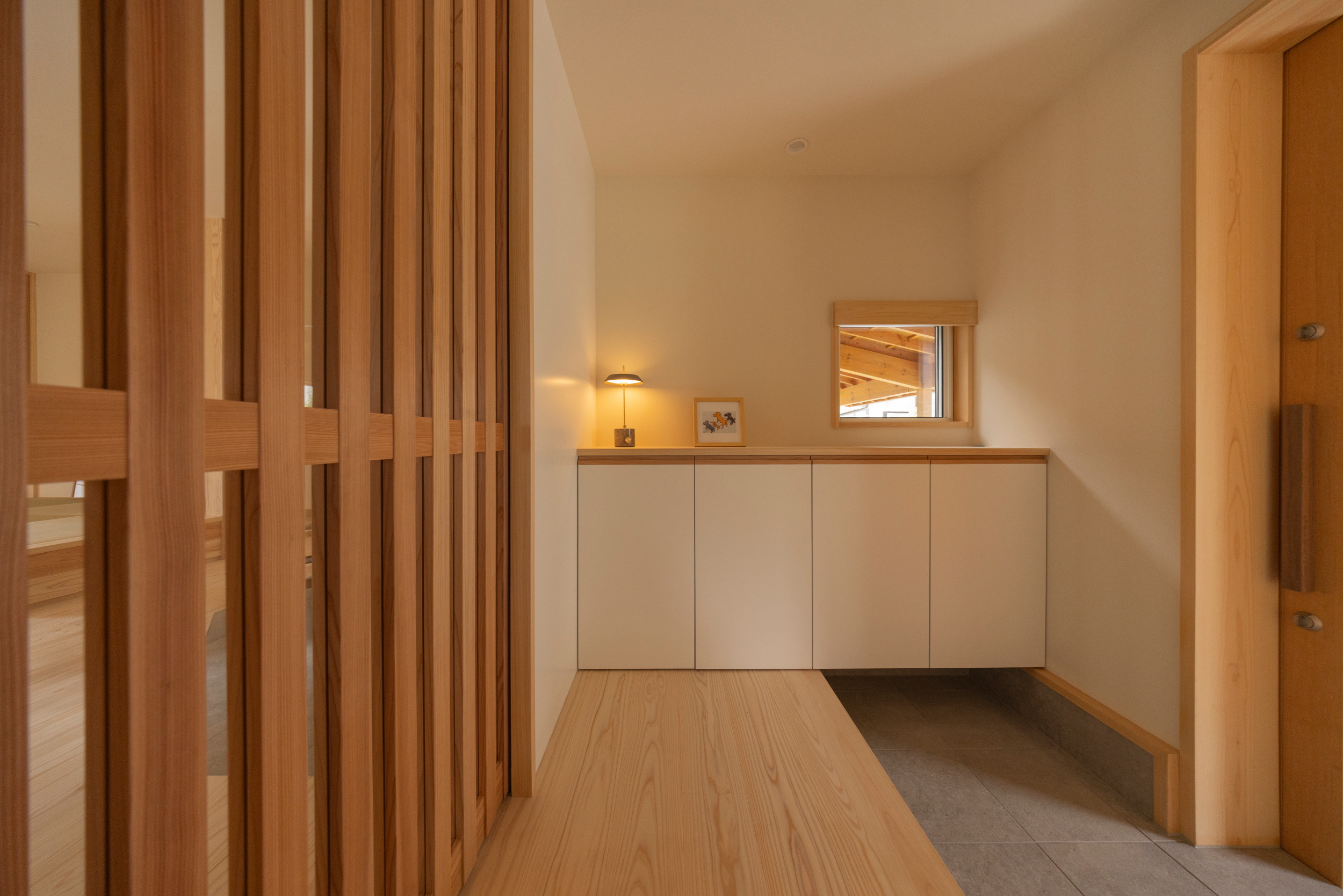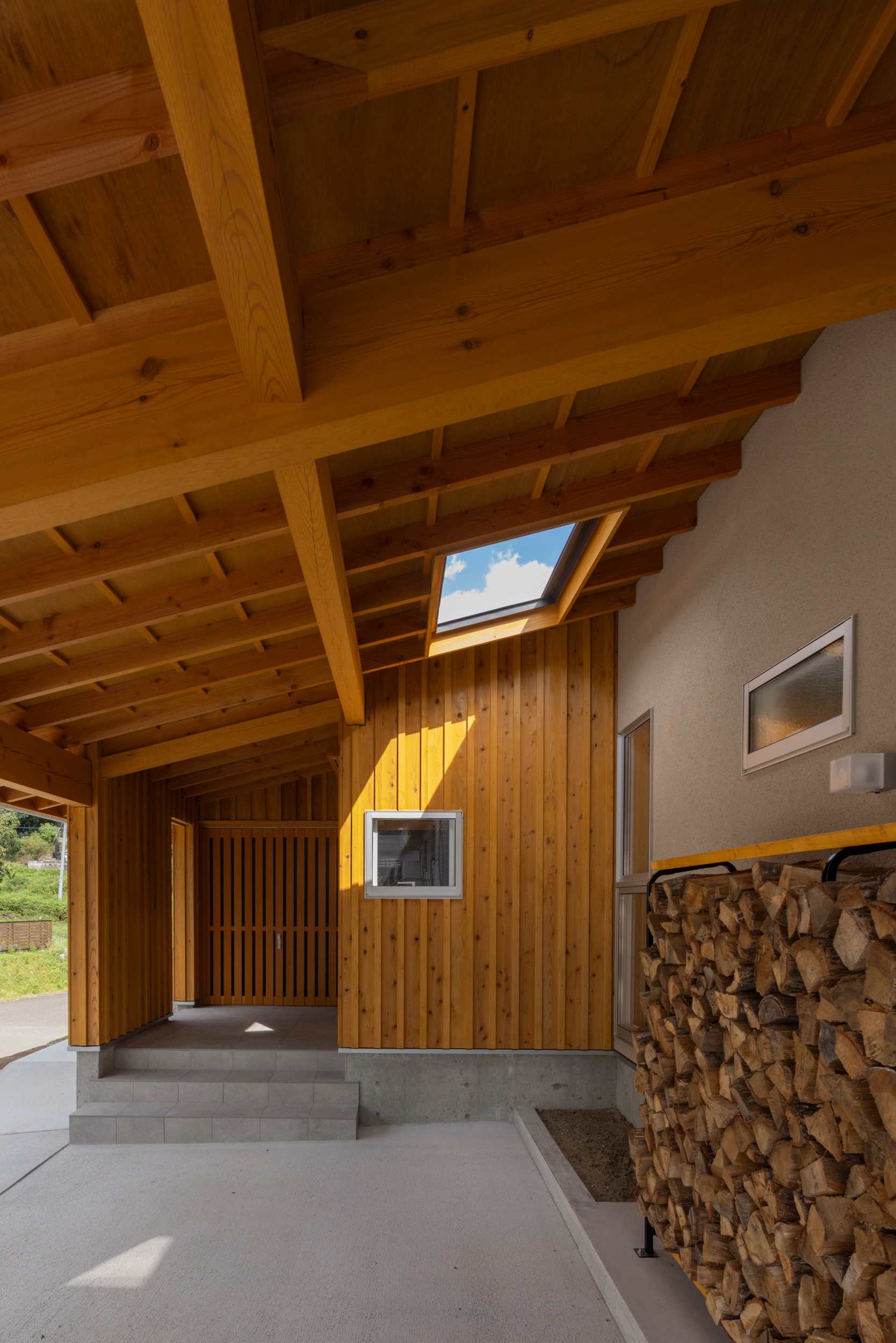 眺望と豊かな緑に抱かれ、夫婦がそれぞれの趣味や時間を慈しみ、心ゆくまで寛げる理想のお家。緩やかな勾配天井の屋根と外収納・ガレージを一体で建築し、落ち着いた雰囲気のデザインとなりました。薪ストーブの炎を囲んで語り合い、檜風呂の香りに包まれながら景色に癒され、借景を望むキッチンで料理を満喫する。そんな、日々の豊かな営みがここにあります。